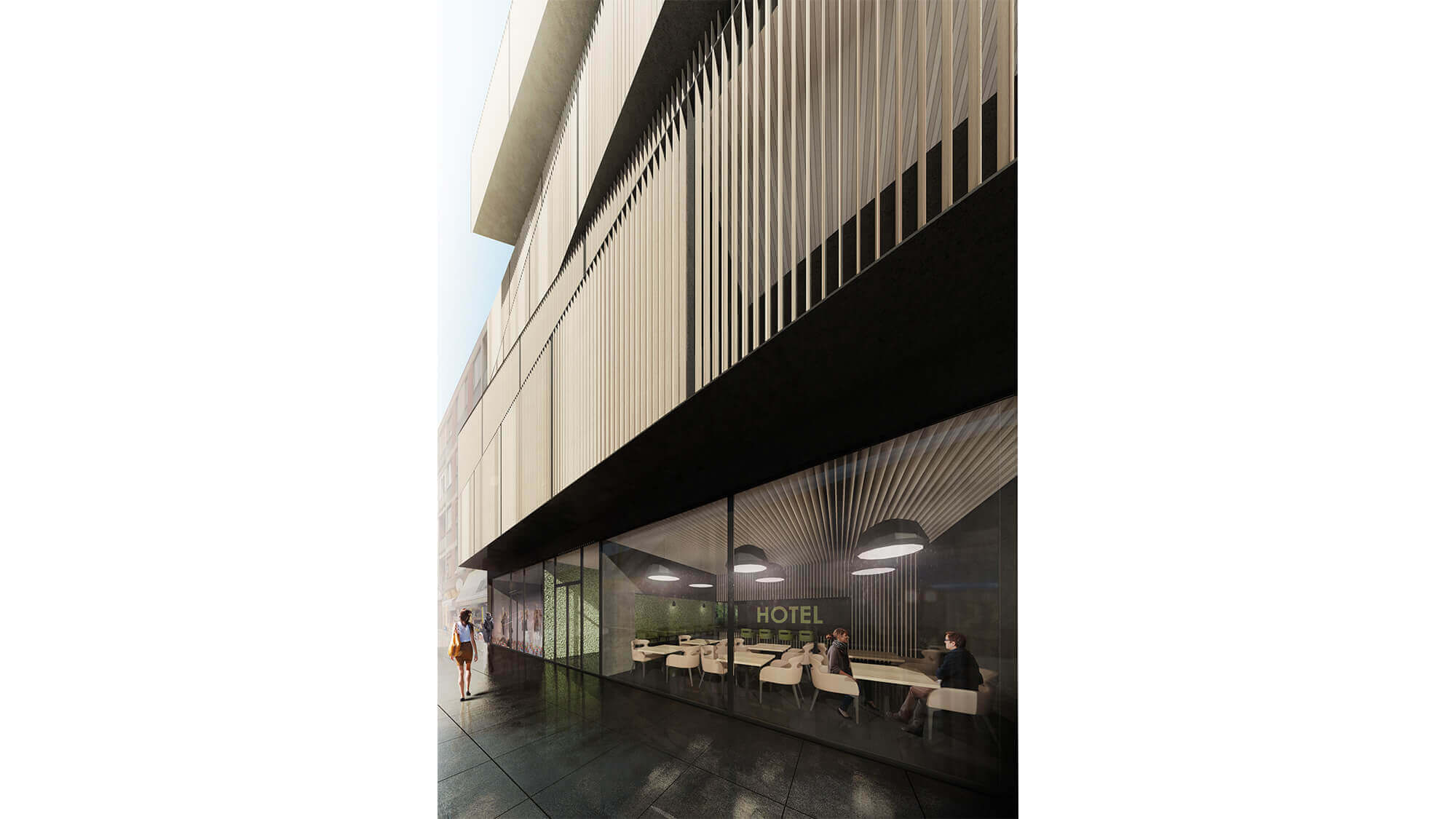 Moćne horizontale međusobno posmaknutih volumena jako dobro igraju svoju ulogu, kako na nižim etažama tako i na višim gdje se skraćuju.
